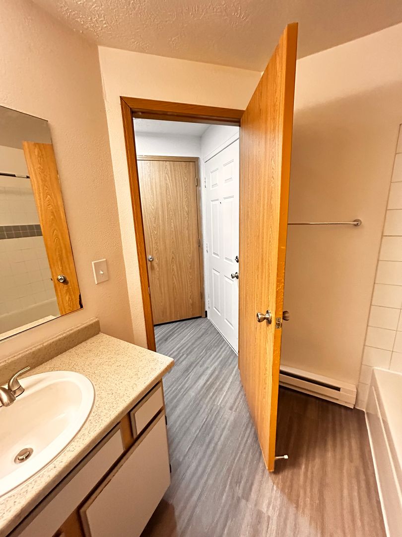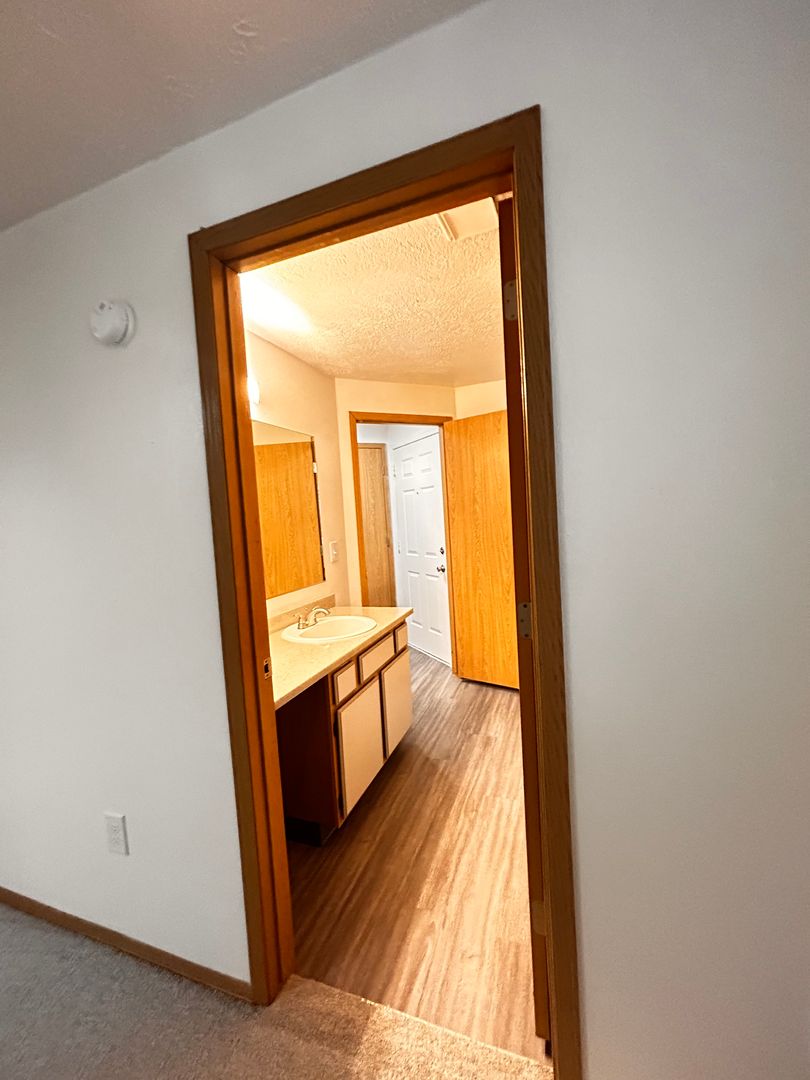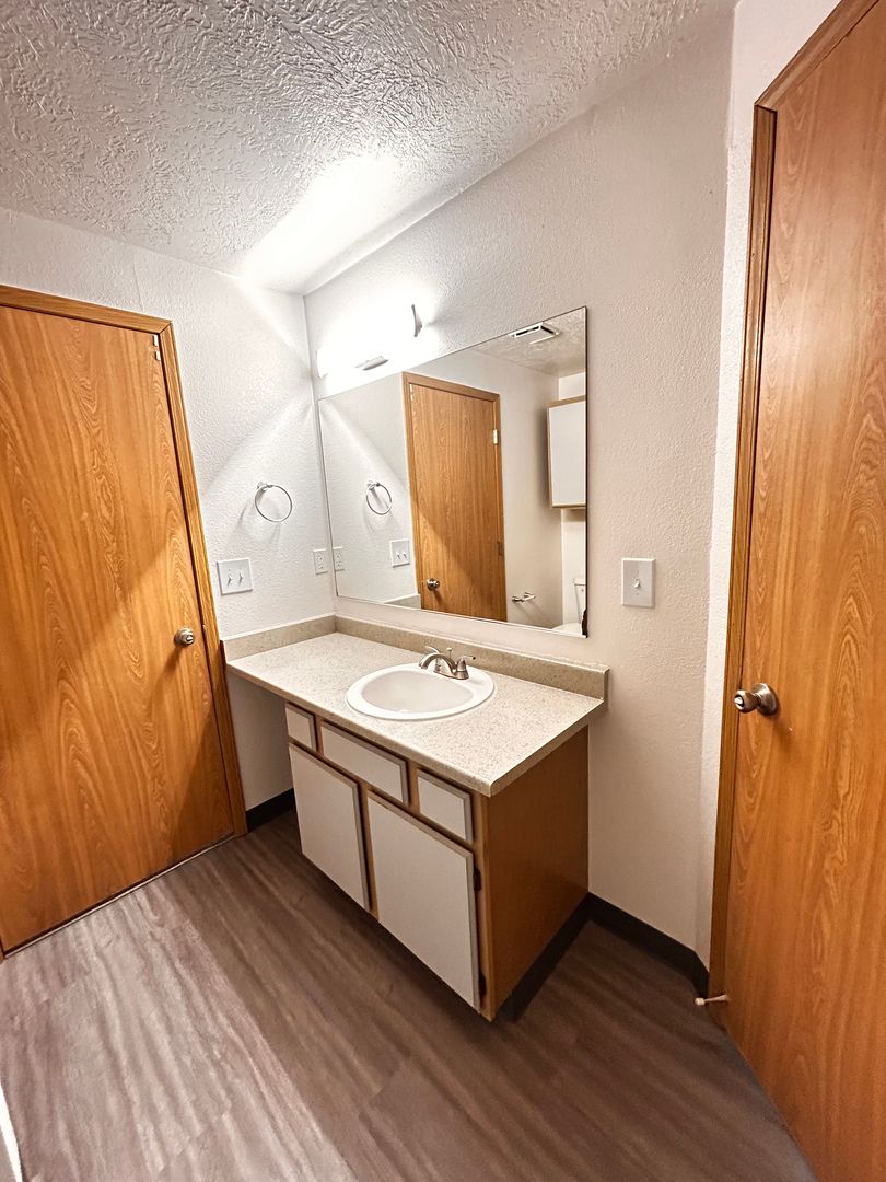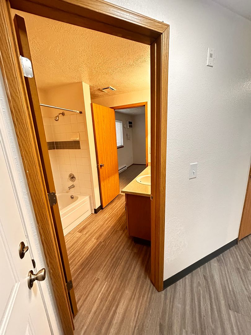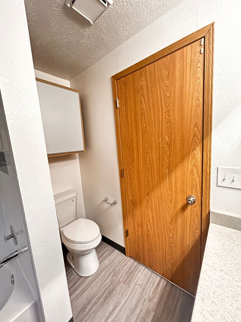 Dual bathroom access: guest entrance + private entry from the bedroom