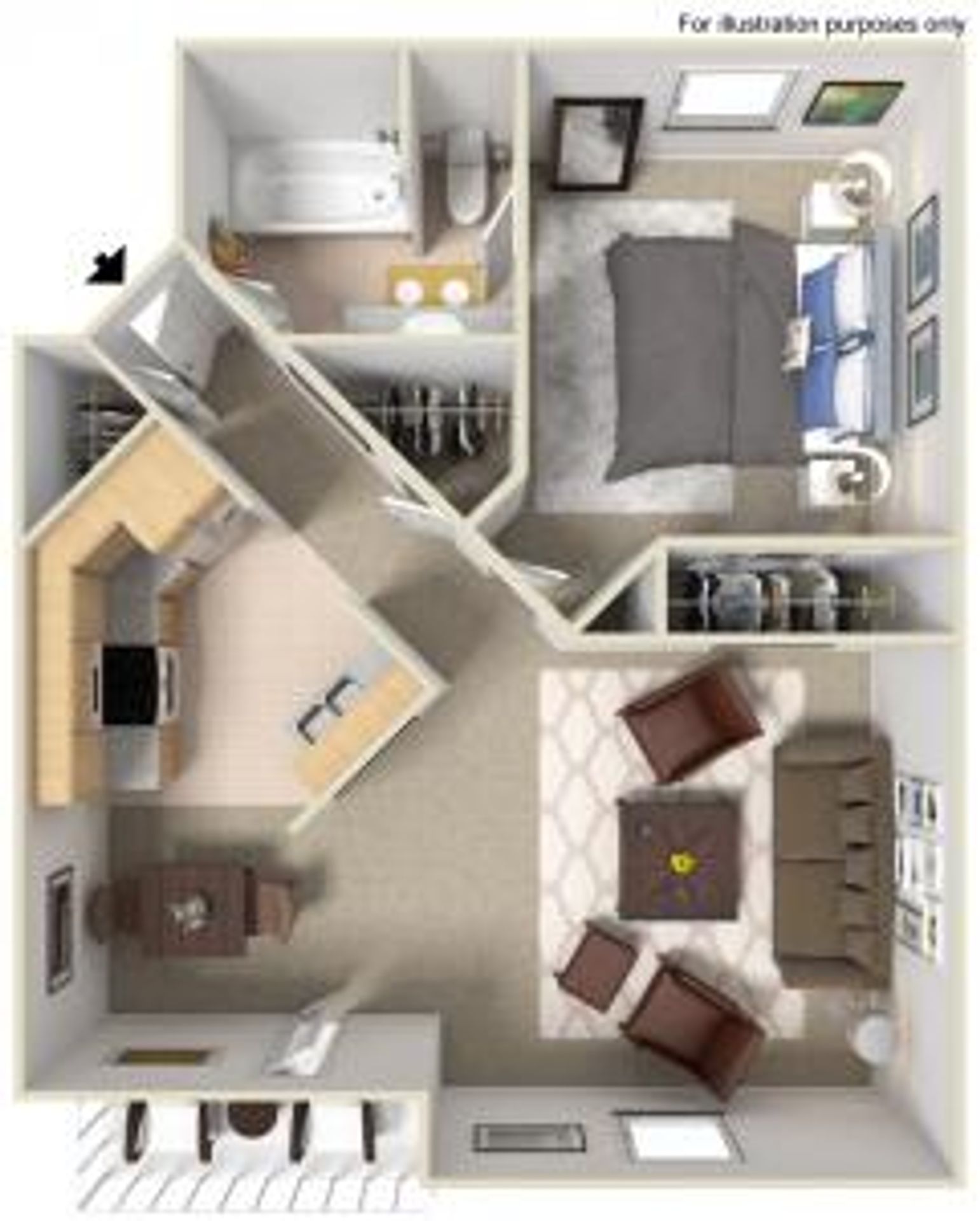 This large 1-bedroom, 1-bathroom apartment (640 sq. ft.) offers a unique and spacious layout designed for comfort and style.